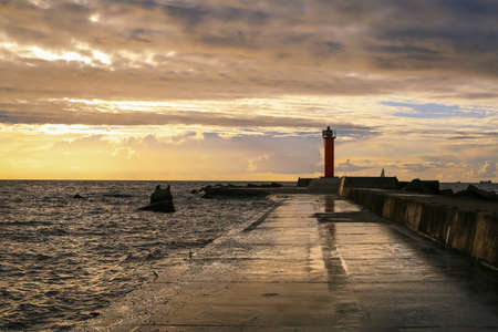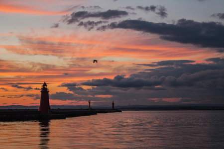 Colorful stormy sunset at the Rigas bay with Mangalsala light house
