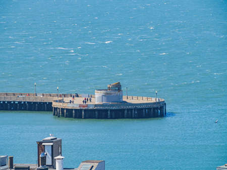 Scenic view of Whitby Pier in sunny autumn day.