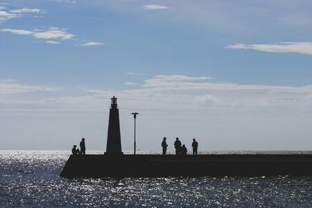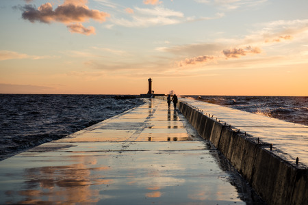 Silhouettes of People on the background of the Baltic Sea with a lighthouse and glare from the sun on the waves in autumn. Baltic state