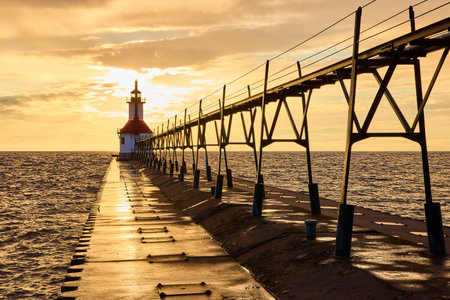 Beautiful sunset on an ocean pier with a lighthouse.