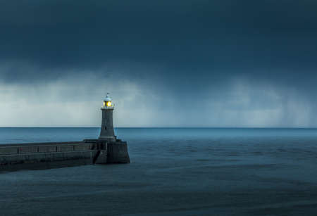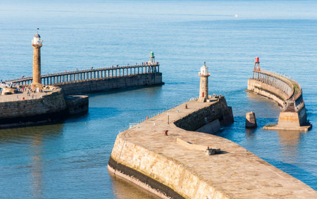 A view of the lighthouse at the entrance to the port of Whitby, UK