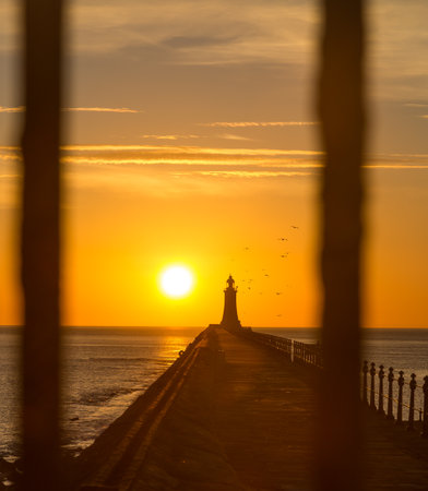 Tynemouth Pier and the Lighthouse through the metal railings with a beautiful vibrant sunrise