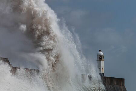 Huge ocean waves crashing into a sea wall and lighthouse (Porthcawl, South Wales, UK)