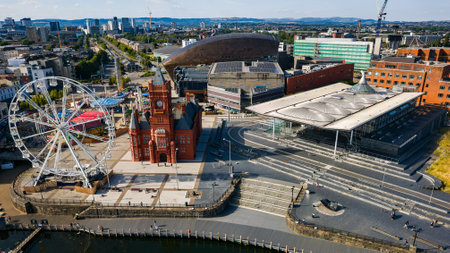 Cardiff, Wales - August 14, 2022: Ferris wheel and historic red Pierhead Building at Cardiff Bay with boats in the marina on a sunny afternoon