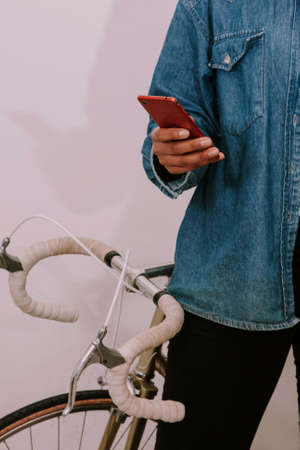 Courier riding a bicycle and looking on the cellphone asnd using delivery app, sustainable transport concept