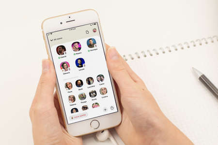 Moscow, Russia, February 20, 2021. Clubhouse app on phone screen. Female hand is keeping smartphone with clubhouse application. Trendy popular social media network for audio messaging.