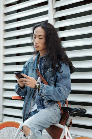 Serious long-haired young Vietnamese guy in denim jacket sitting on bicycle rack against shutters and scrolling through social media on smartphone