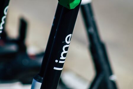 Tel Aviv Israel January 11, 2020 View of a Lime brand electric scooter parked in the streets of Tel Aviv in winter