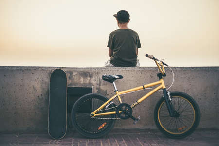 Back view of a teen sitting on a wall with bicycle and skateboard. Young rider relaxing after a fun day of jump and tricks with his bmx. Teenager waiting friends for going to the skatepark together.