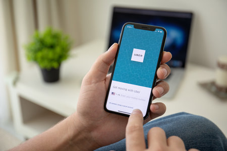 Alushta, Russia - July 29, 2018: Man hand holding iPhone X with application Taxi Uber on the screen in the car. iPhone 10 was created and developed by the Apple inc.