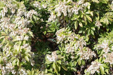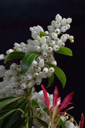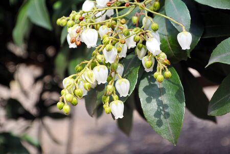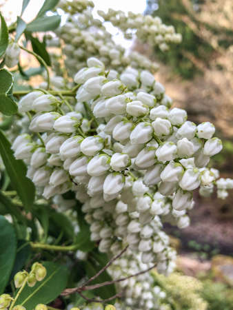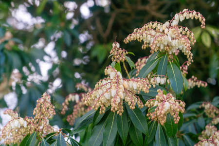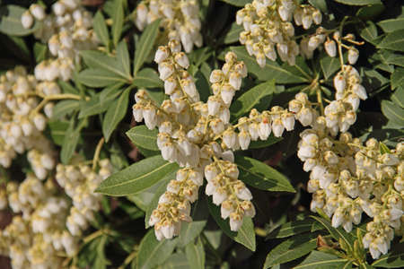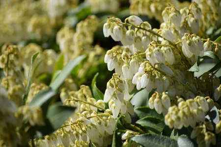 Japanese andromeda (Pieris Japonica) flowers.Ericaceae evergreen shrub and toxic plants. Many white pot-shaped flowers bloom from March to May.