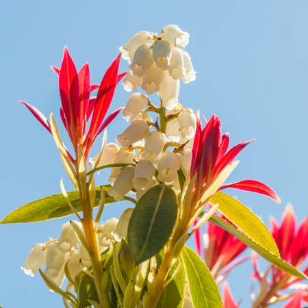 Pieris japonica 'Forest Flame' a spring flowering evergreen shrub plant with a white springtime flower, stock photo image