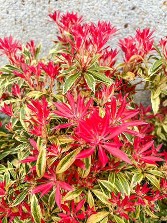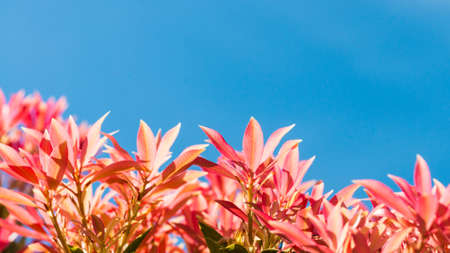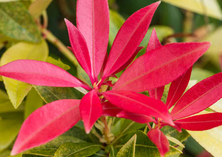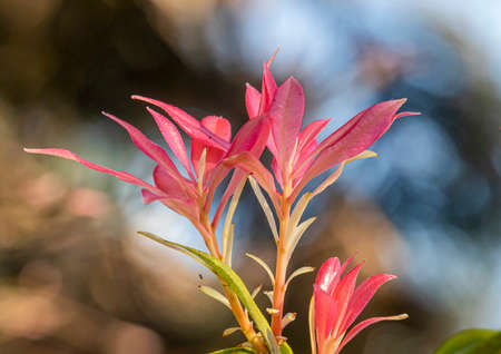 Pieris japonica red young shoots in the spring. Japanese andromeda plant leaves on the blurred background. Japanese pieris ornamental shrub.