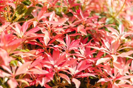A macro shot of the red leaves of a pieris bush.