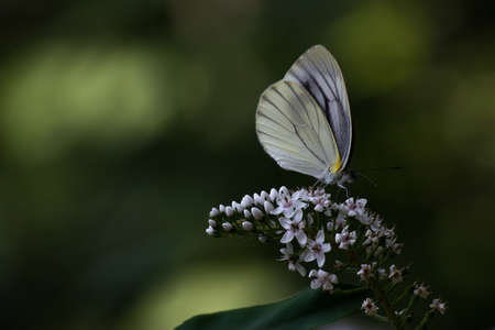 Beautiful tiny white butterfly sitting on a small white flower