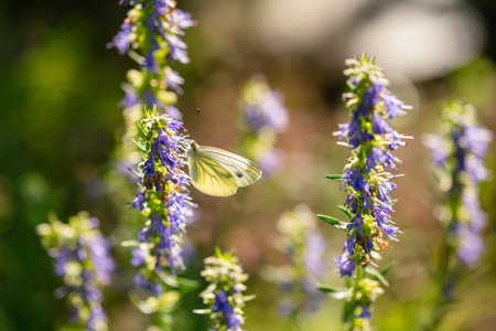Large White Cabbage Butterfly Sitting On A Blooming Hyssop Branch