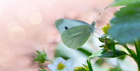 Butterfly flies over strawberry plant in grass in rays of sunlight.