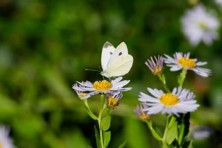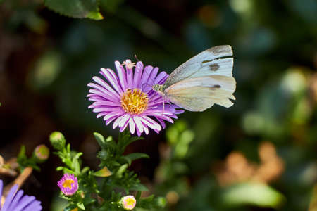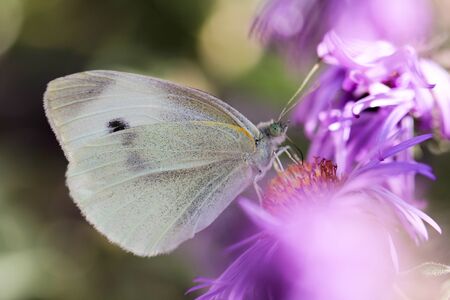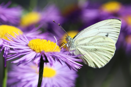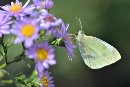 close on pieride butterfly feeding pink aster flowers