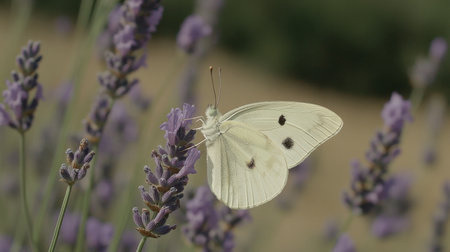 A stunning white butterfly rests gracefully on vibrant lavender flowers, capturing the essence of a tranquil summer meadow filled with beauty.