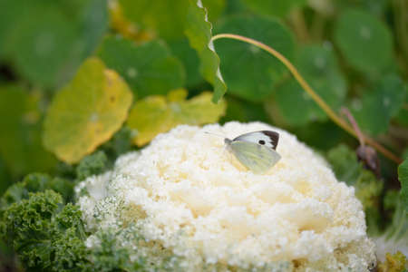 White cabbage butterfly sitting on a cabbage. Insect pest on a vegetable