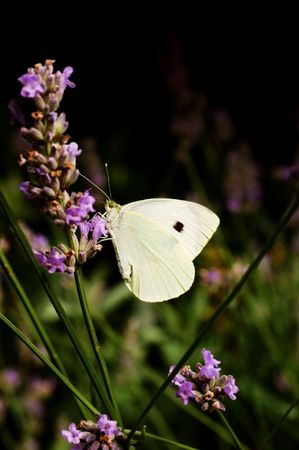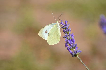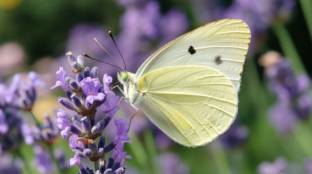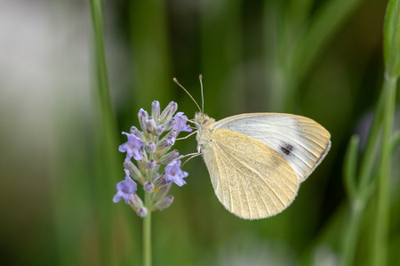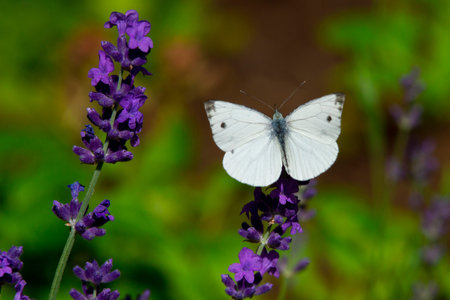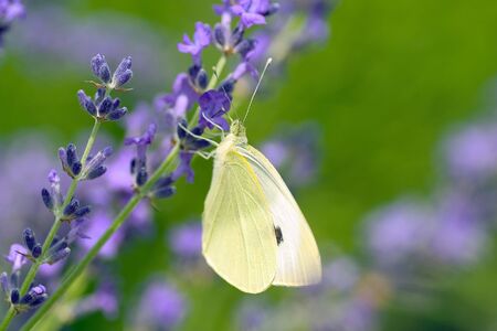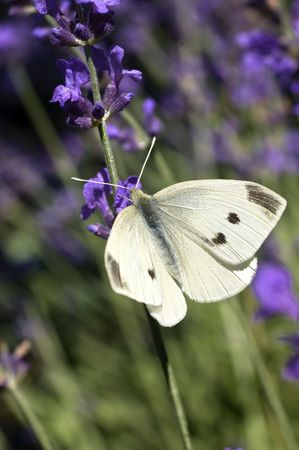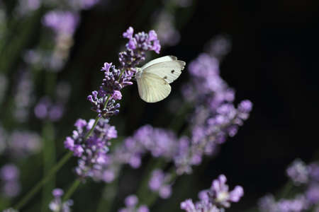 Closeup photo of a Cabbage White butterfly on lavender