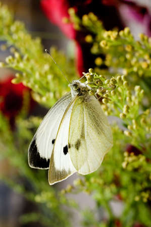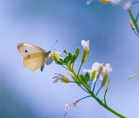 Small white common european butterfly sitting on the flowers