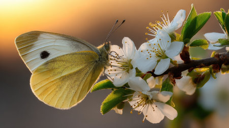 Photograph captures a pale yellow and white butterfly, featuring a single dark spot on its upper wing, delicately perched on a cluster of small, white flowers growing on a brown branch. The background suggests a warm, glowing sunset or sunrise, casting a soft, golden illumination across the insect and highlighting the fresh green leaves surrounding the blossoms.