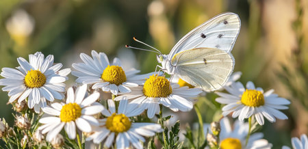 A butterfly perched on daisies in the warm sunlight, symbolizing hope and beauty amidst the breathtaking nature. High-quality photograph. --ar 31:15 --v 6.1 Job ID: d70cc888-ed57-4237-8bdf-85a1e0d17f35