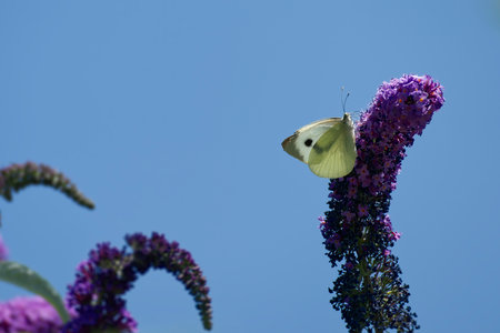 Large white butterfly (Pieris brassicae) perched on summer lilac in Zurich, Switzerland