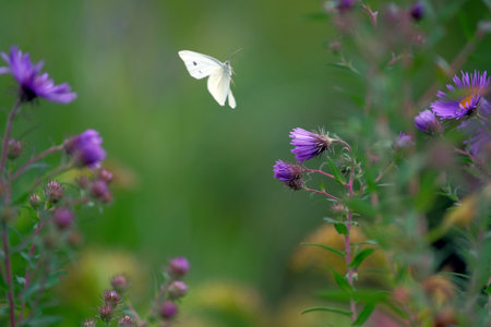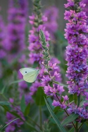 A white cabbage butterfly sits on a bright purple flower. Pollination of flowering plants by insects in summer. Beautiful vertical summer background for design. Top view.