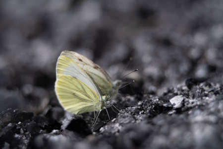 Pair of white butterflies is feeding on the ground, Kaluga region, Russia