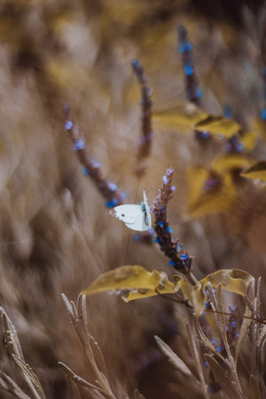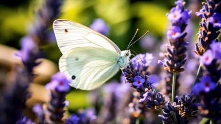 white butterfly perched delicately on a bed of lavender plants, adorned with small purple flowers. captured through the lens of the topcor 58mm f14, the image showcases a monochromatic scheme with light indigo and light green hues. the vibrant color combinations create a pictorial and visually striking composition. this uhd image captures the beauty of nature in all its vibrant glory. ai generated