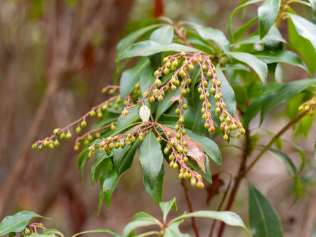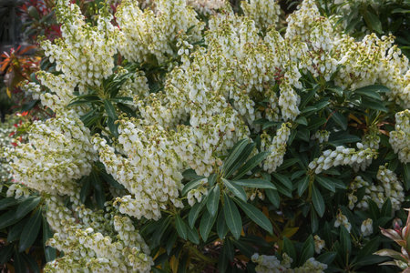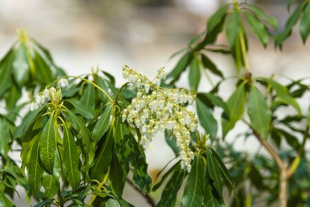 Japanese andromeda (Pieris japonica) flowers. Poisonous Ericaceae evergreen shrub. Numerous bell-shaped flowers bloom in panicles from March to May.