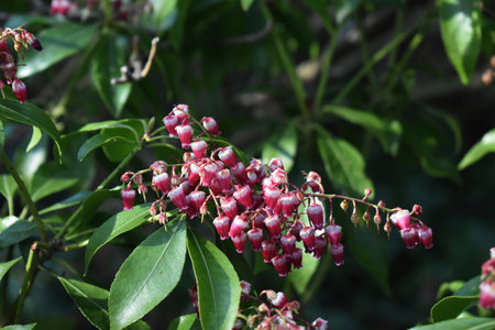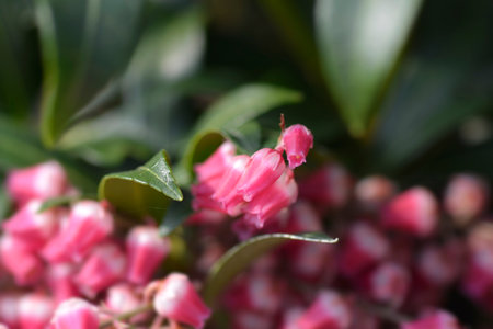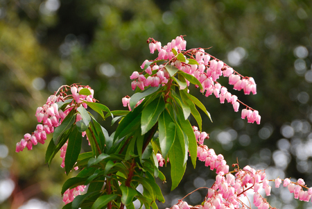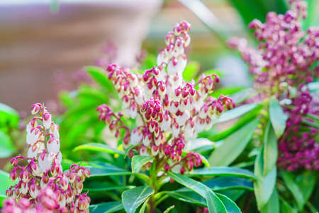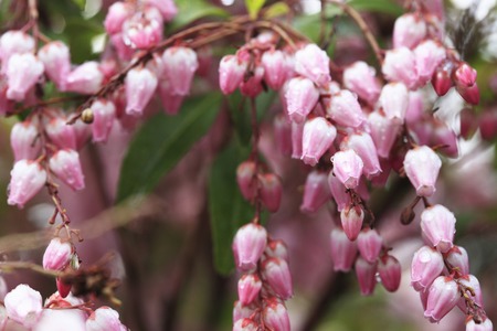 Japanese andromeda ( Pieris japonica ) flowers. Ericaceae evergreen shrub. Blooms from March to May with many white or pink bell-shaped flowers. Berries and leaves are poisonous.
