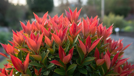 A photo of a unique plant with lush green leaves and a few red leaves on the shoots called Photinia Frasieri