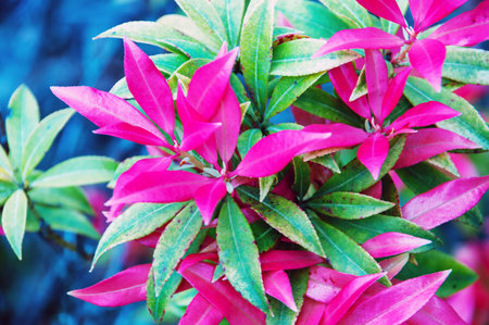 Pieris japonica red young shoots in the spring. Japanese andromeda plant leaves on the blurred background. Japanese pieris ornamental shrub.