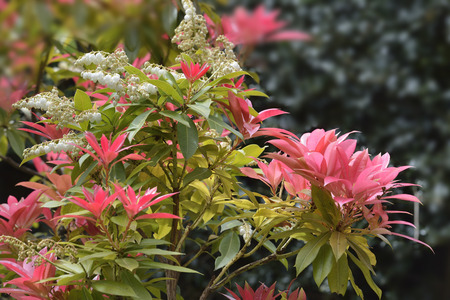 Pieris, andromedas or fetterbushes. Ornamental plants for garden, park. Landscape design concept