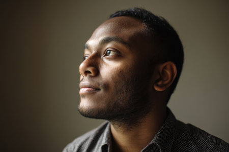 Thoughtful man gazing upward, showcasing a serene expression. Subtle lighting highlights facial features against a smooth backdrop. Dressed in a textured shirt, his gaze is focused