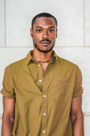 Close up, head short of Young African American Man with beard in New York, wearing green short sleeve shirt, necklace, collar unbuttoned, standing against white marble wall, seriously looking forward.
