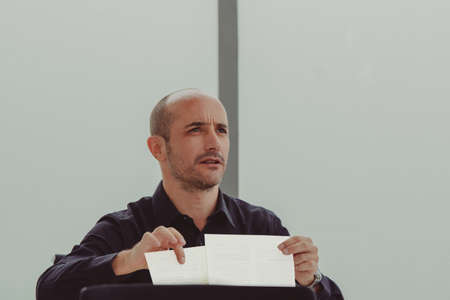 Businessman holds documents in his hands on a red background