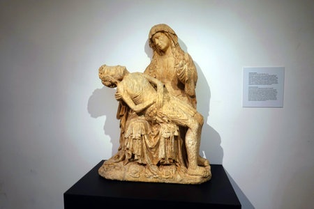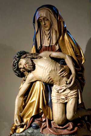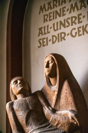Wietmarschen, Germany - July 8 2021 - This lovely statue from around 1500 is made from a single block of wood. Mary holds the body of her crucified Son. Her pain becomes clear through vividly emerging