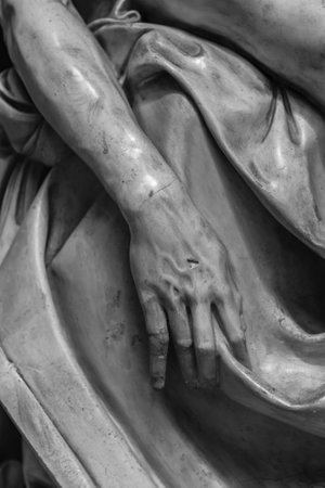 foreground detail of a replica of Miguel Angel famous sculpture the Pieta at Adolfo Suarez park of Torrejon de Ardoz, madrid, spain with wall of bricks as background