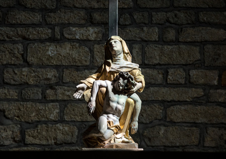 Bronze Statue of dead Jesus Christ down from the cross, being embraced by the Virgin Mary. On background a gray rough wall. It can be used for concepts and events.