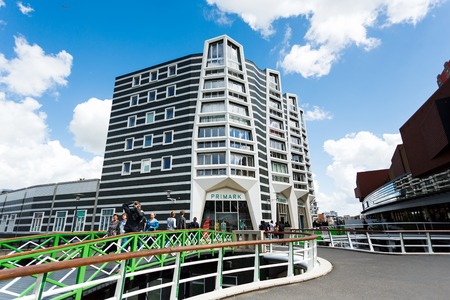 Zaandam, Netherlands - July 02 2016: Some people are walking at the Primark building, famous discount fashion and accessories retailer of Zaandam