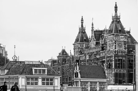 AMSTERDAM, NETHERLANDS. JUNE 06, 2021. Beautiful facade of Amsterdam Vity Center on the background, old dutch buildings. Black and white photography.