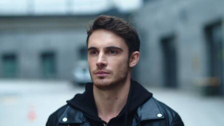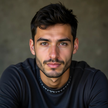 A young man stands in front of a muted wall, wearing a relaxed t-shirt. His confident gaze and gentle smile convey a sense of ease and approachability, illuminated by natural light.