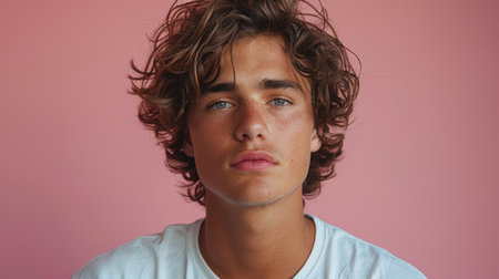 portrait of a young man with curly hair on a pink background