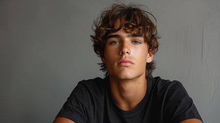 Young Man With Curly Brown Hair Posing in Front of a Grey Wall