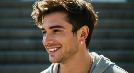 A smiling man wearing a small hoop earring for lifestyle and having short hair