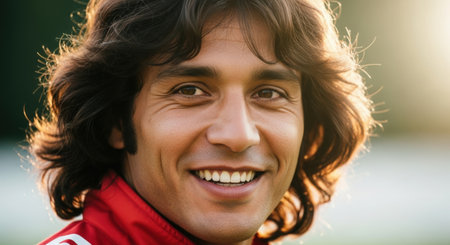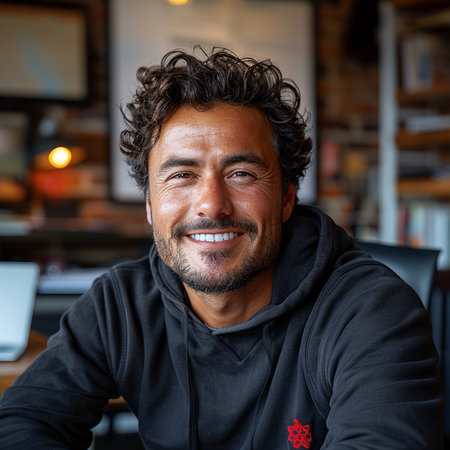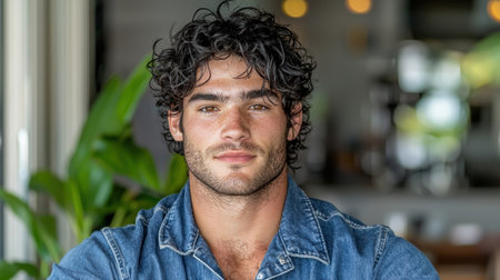 This vibrant portrayal captures a Brazilian man, exuding happiness with a warm smile, immersed in a cozy atmosphere filled with natural light and personal touches.